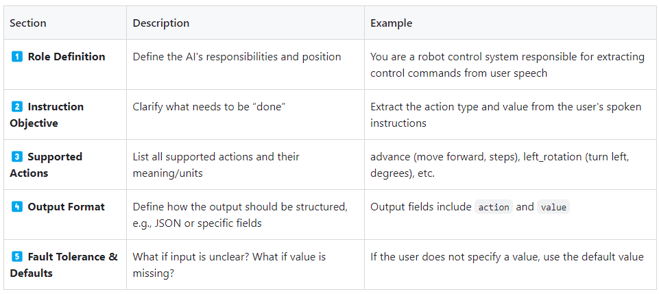 A high-quality system prompt typically consists of the following five parts: