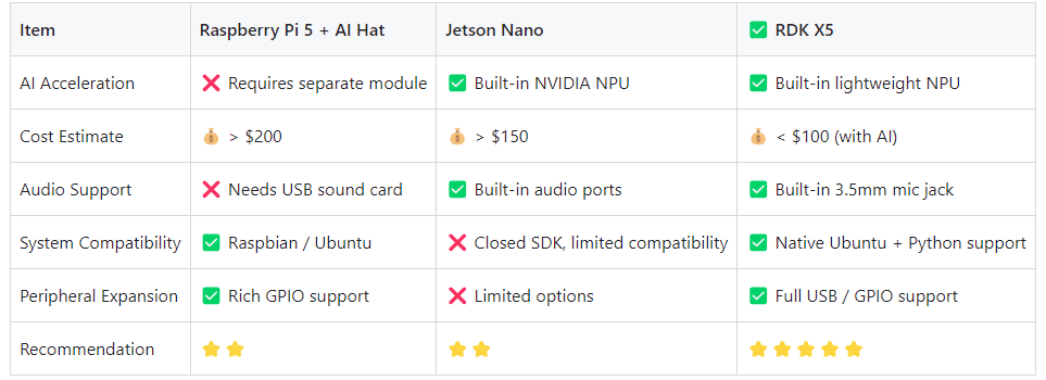 Considering cost, audio capabilities, AI API support, and ease of deployment, RDK X5 emerged as the optimal choice.
