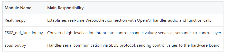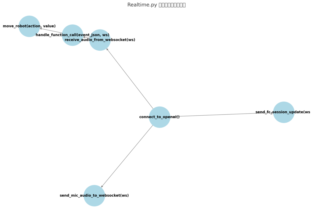 Realtime.py is the brain of the system, responsible for audio input, real-time recognition, event parsing, and function calls. It establishes continuous communication with the OpenAI Realtime API through WebSocket, enabling simultaneous speech recognition and control.