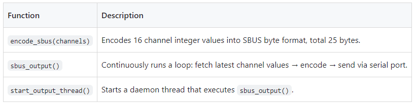 ▪️Encodes control values of 16 channels into a byte stream using the encode_sbus() function.